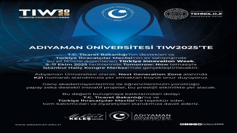 28Eki2025Adıyaman Üniversitesi, Türkiye’nin En Büyük İnovasyon Buluşması Türkiye Innovation Week 2025'te Yerini Aldıİnovasyon ekosistemini geliştirmek, büyütmek ve inovasyonun sürdürülebilirliğini güvence altına almak amacıyla T.C. Tica...